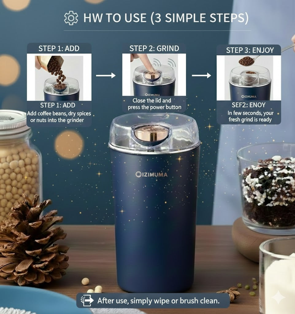 A powerful multi-purpose grinder that easily pulverizes coffee beans, spices, nuts, and grains in seconds. Featuring durable stainless steel blades and a simple one-touch design, it is the ultimate tool for every kitchen task.